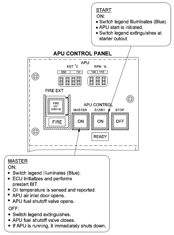 When the READY light is illuminated, depressing the START push button closes the APU Start Contactor connecting the APU starter on the accessory gear box to the battery tie bus, initiating rotation of the APU. The blue ON legend within the START switch will illuminate as long as the starter is engaged.