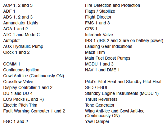Missing from this list are the four TRUs, which each get their power from a main AC bus. And of course that means all on-side electrical loads are suspect.